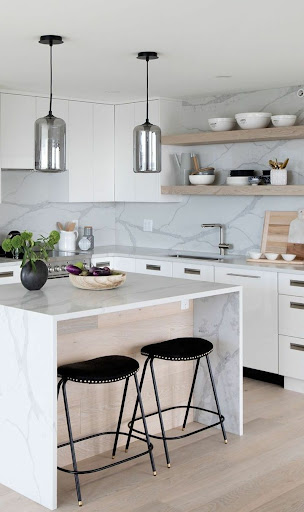 A stunning marble countertop and subtle gray backsplash joins white Shaker style cabinetry and black stainless appliances. Kitchen With Country Charm 8 Photos. A Dingy Kitchen Gets a Bright White Makeover 14 Photos.